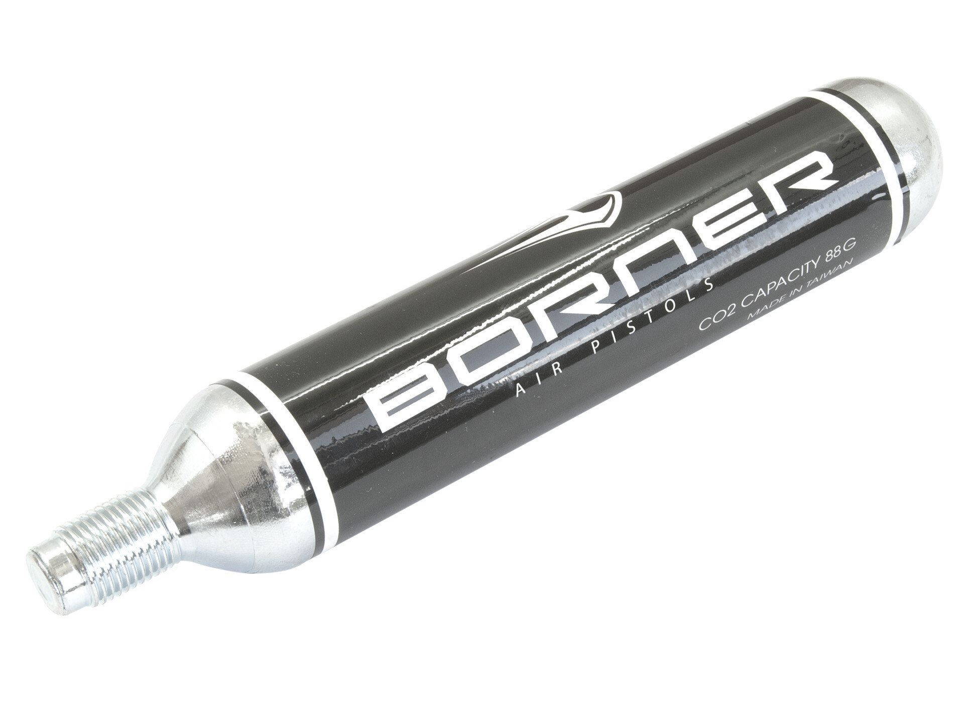 CO2 bombička značky Borner s 88g náplní pro pohon CO2 zbraní s ventilem na závit. Vhodná pro všechny značky jako jsou Umarex, Walther, Crosman, Sig Sauer a další.