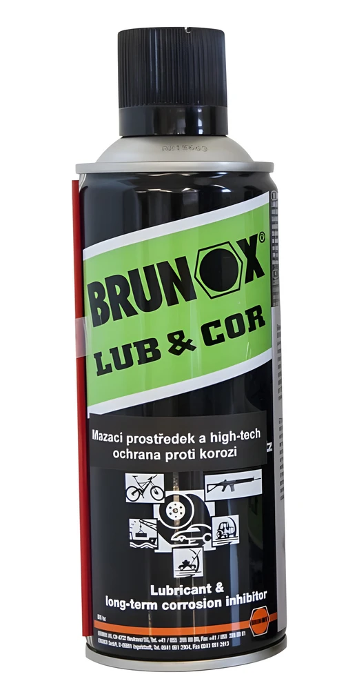 Brunox LUB&COR, konzervační mazivo, vyšší a dlouhodobá ochrana proti korozi, víceúčolový olej použitelný nejen na zbraně.