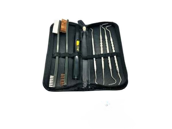 Sada pro čištění zbraní obsahující 4 nerezové háčky s různými koncovkami, 1 čistící pero na optiku, 1 oboustranný čistící kartáček s nylonovými štětinami a 1 oboustranný kartáček s mosaznými štětinami. To vše je uloženo v koženém pouzdře uzavíratelném na zip.
