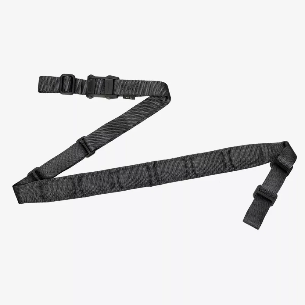 Popruh Magpul MS1 polstrovaný je vhodný pro manipulaci se zbraní v nejrůznějších pozicích. Po nastavení se nepovoluje a nemá žádná očka, nebo smyčky, které by představovaly potenciálních nebezpečí zachycení. Dvoubodový popruh MS1 umožňuje hladký přechod přes rameno, rychlé nastavení pro nošení pušky bez použití rukou i podporu při střelbě z různých pozic.