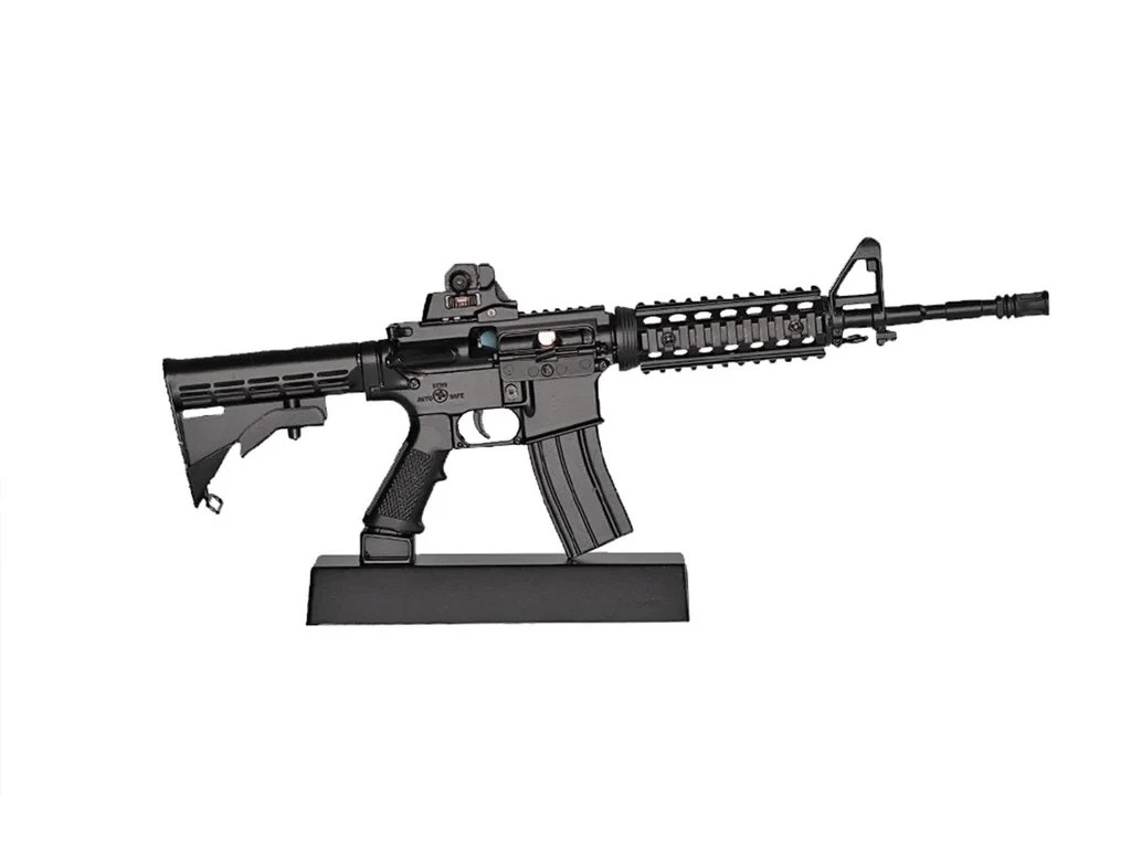 Tato propracovaná miniatura je téměř ve všem shodná s originálem (samozřejmě s výjimkou střelby) a dodává se s praktickým stojánkem a 3 replikami nábojů ráže .223 Remignton, které můžete napáskovat do odnímatelného zásobníku. Závěr je plně pohyblivý, ale nepodává náboje do komory. Po stažení závěru do zadní polohy se otevře kryt výhozního okénka.