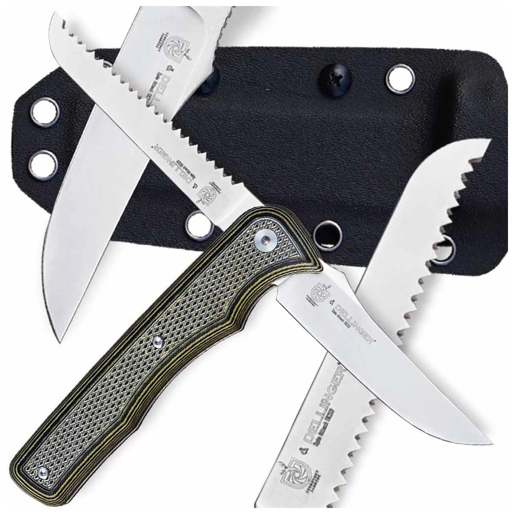 Rotační lovecký nůž Dellinger Spin Attack DC53 je varianta EDC nože (pro každodenní použití), který je inspirovaný touhou o přežití za jakýchkoliv podmínek. Vyroben je z prvotřídních materiálů, pevný a zároveň ergonomický. Čepel pilky i nože délky 10 cm je vyrobena z vynikající nástrojové oceli DC53 o tvrdosti 58 HRC, má matnou povrchovou úpravu STONEWASHED. Rukojeť ze zeleno/černé barvy z materiálu G10 (velmi odolný a pevný kompozitní materiál) se stříbrnými šroubky a pojistkou button lock proti zavření nože. Nůž je vybaven taktéž kydexovým pouzdrem s otočnou sponou pro nošení jak ve vodorovné, tak svislé pozici.