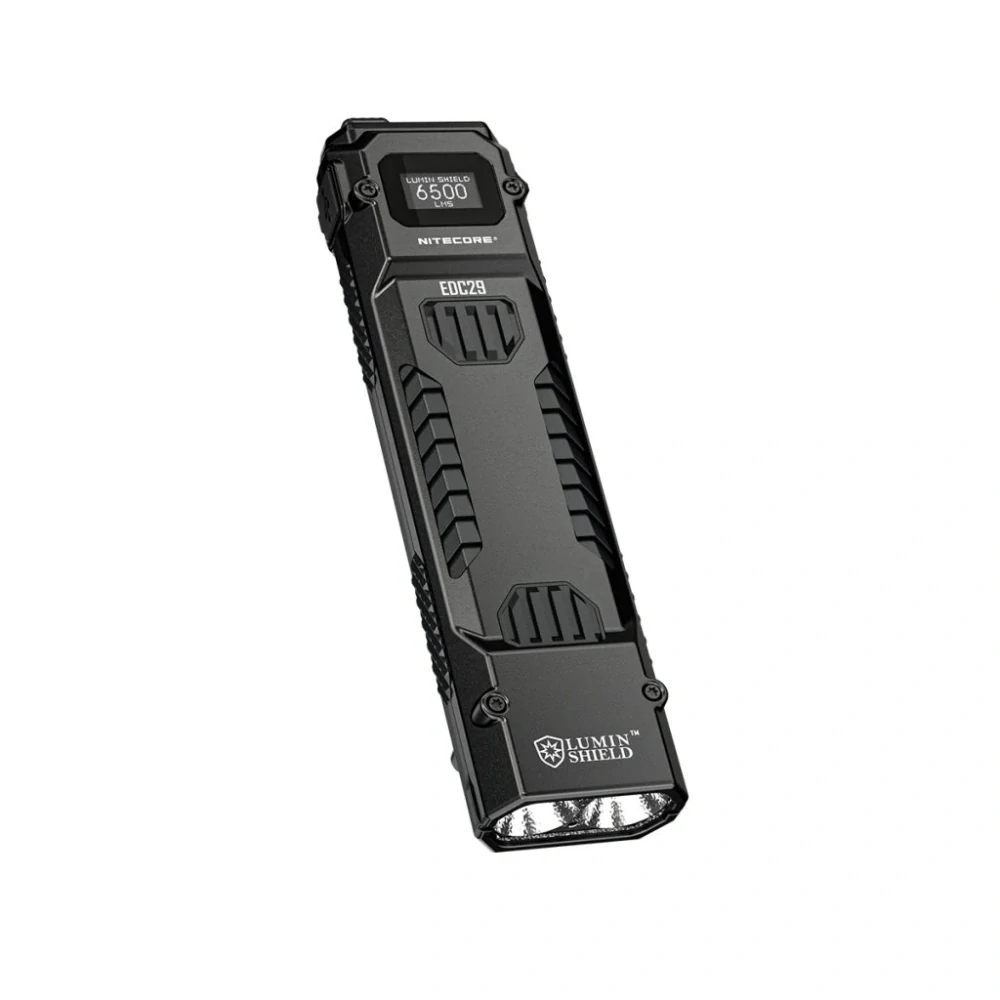 EDC29 svítilna má koncepci nezvykle plochého tvaru vhodného pro každodení nošení. Nově využívá jako zdroj světla 2x LED UHi 20 MAX. Díky novým led se prodloužil dosvit až na 400 metrů s vysokým výkonem světelného toku 6 500 lm a intenzitou světelného kuželu (40 230cd). K ovládání svítilny slouží dvě velká tlačítka nacházející se na konci svítilny. Jedno vystouplé ON/OFF a druhé nízké (dvoustupňové) tlačítko MODE. První tlačítko slouží k zapínání / vypínání jak stálého tak momentového světla. Druhé tlačítko MODE slouží k přepínání 5 světelných režimů a stroboskopu. Tlačítko je dvoustupňové. Namáčknutím aktivujeme režim Turbo (6 500 lm) a domáčnutím tlačítka aktivujeme režim proměnlivého stroboskopu 2 generace. Tlačítka svítilny lze i bezpečně uzamknout 2 druhy zámku. V prvním případě lze uzamknout tlačítko ON/OFF a funkční je jen tlačítko mode pro funkci TURBO-READY a funkci STROBO-READY. V případě druhé možnosti zámku uzamknete funkci obou tlačítek svítilny tak, aby v žádném případě nedošlo k jejímu nechtěnému zapnutí např. při přepravě v zavazadlovém prostoru. K tomu slouží posuvné tlačítko na boku svítilny. Další ochranou před nechtěným sepnutí TURBO výkonu např. v zavazadlovém prostoru je je senzor vzdálenosti, umístěný v hlavě reflektoru. Li-Ion akumulátoru o kapacitě 2 500 mAh je napájen přes integrovaný micro USB-C konektor. Na těle svítilny se nachází OLED display, který zobrazuje jak zvolený režim svícení tak i dobu svitu na daný režim. NITECORE EDC29 má tělo vyrobené z nerezové oceli s titanovou povrchovou úpravou. Při své ploché konstrukci a hmotnosti pouze 160 g je to ideální kapesní svítilna od Nitecore pro každodení nošení.